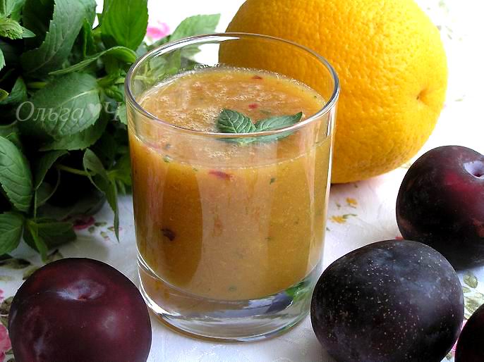 Перед Вами бесподобный летний фреш. В основе сочный апельсин, дополненный бархатной сливой и освежающей ноткой мяты. Попробуйте ;)